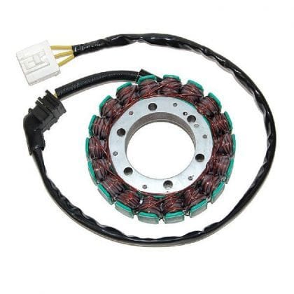 Desconecta el conector del estator y mide la resistencia entre cada par de cables con un multimetro en ohmios. Las lecturas deben ser similares entre todas las combinaciones (tipicamente 0.1-1 ohm). Si alguna lectura es infinita (circuito abierto) o muy baja (cortocircuito), el estator esta defectuoso.