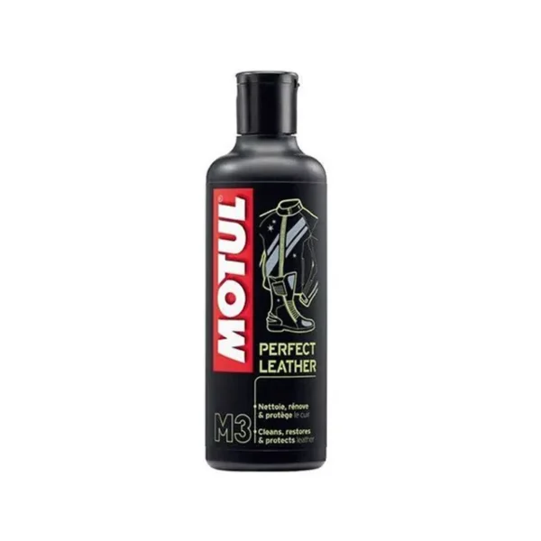 Cada parte de la moto necesita un cuidado específico. Lanzada en 2011, la línea de productos Motul® MC Care™ se desarrolló para el mantenimiento y cuidado completos de las motocicletas, los motoristas y sus equipos. Categoría de productos: cuidado de los motoristas y sus equipos Motul®MC CARE™ M3 Perfect Leather limpia, nutre y repara todo tipo de piel. Protege de las agresiones externas. Impermeable (efecto antilluvia). Prolonga la vida de la piel.
