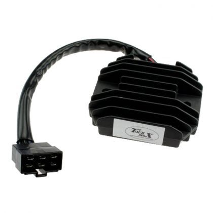 Regulador/rectificador TOURMAX, recambio directo del original. Convierte la corriente alterna del estator en continua y regula el voltaje para proteger la bateria y el circuito electrico. Si la bateria se descarga frecuentemente o el voltaje en bornes supera 14.8V con el motor en marcha, es probable que el regulador este averiado.